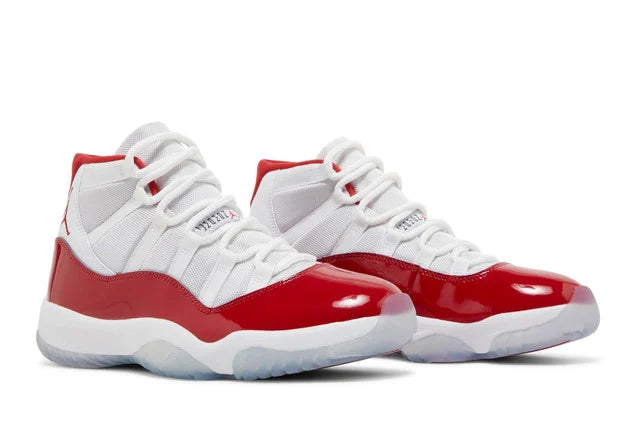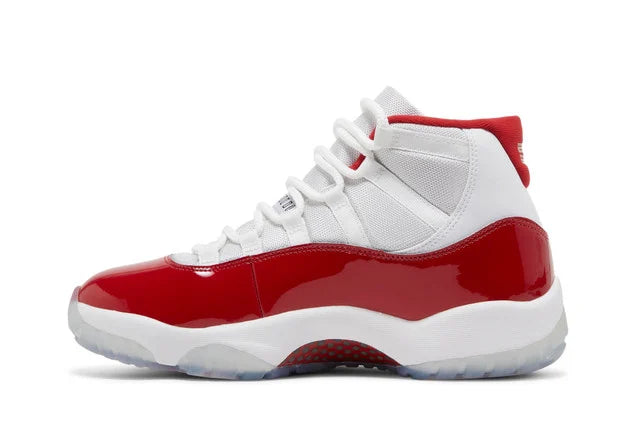 A new entry in the lineage of the Air Jordan 11, the 'Cherry' also known as 'Varsity Red' features a clean colorway that utilizes a Chicago Bulls inspired palette. The upper features white mesh with tonal webbing eyelets, while a shiny patent leather mudguard wraps around the entire shoe in a deep red hue. A red Jumpman logo appears on the back heel area, while a translucent rubber outsole finishes the look. A lightweight Phylon midsole provides cushioning while a carbon fiber spring plate offers structural support underfoot.