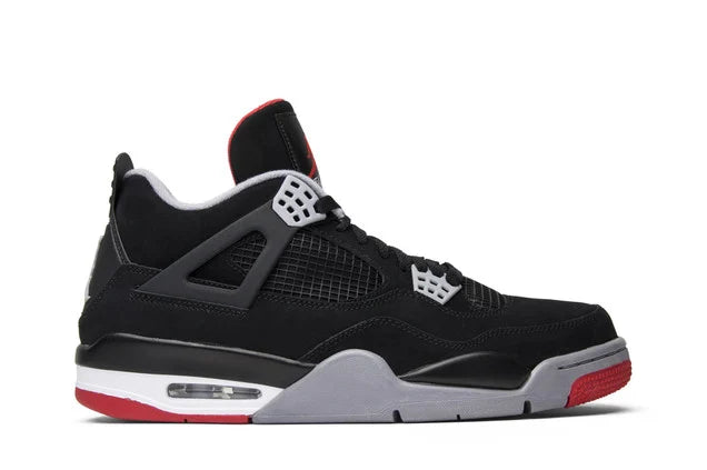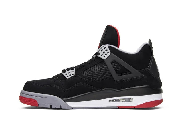 The Air Jordan 4 returns in retro form for the first time since the original release in 1989. This Black and Red color scheme is one of the OG colorways, featuring black nubuck paneling throughout the upper. Cement Grey and Red accents are exactly like the original release, even down to the NIKE AIR on the back heel tab.