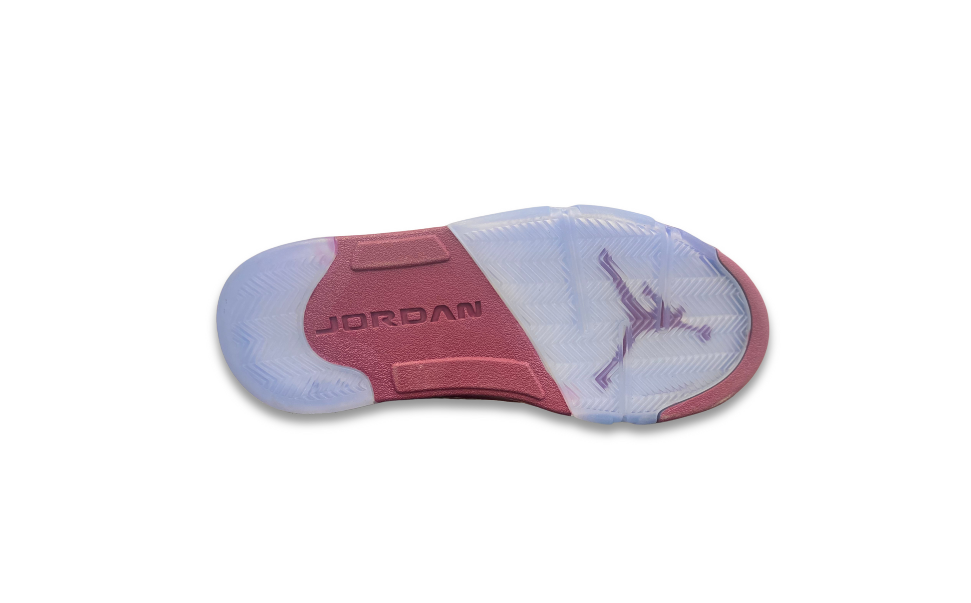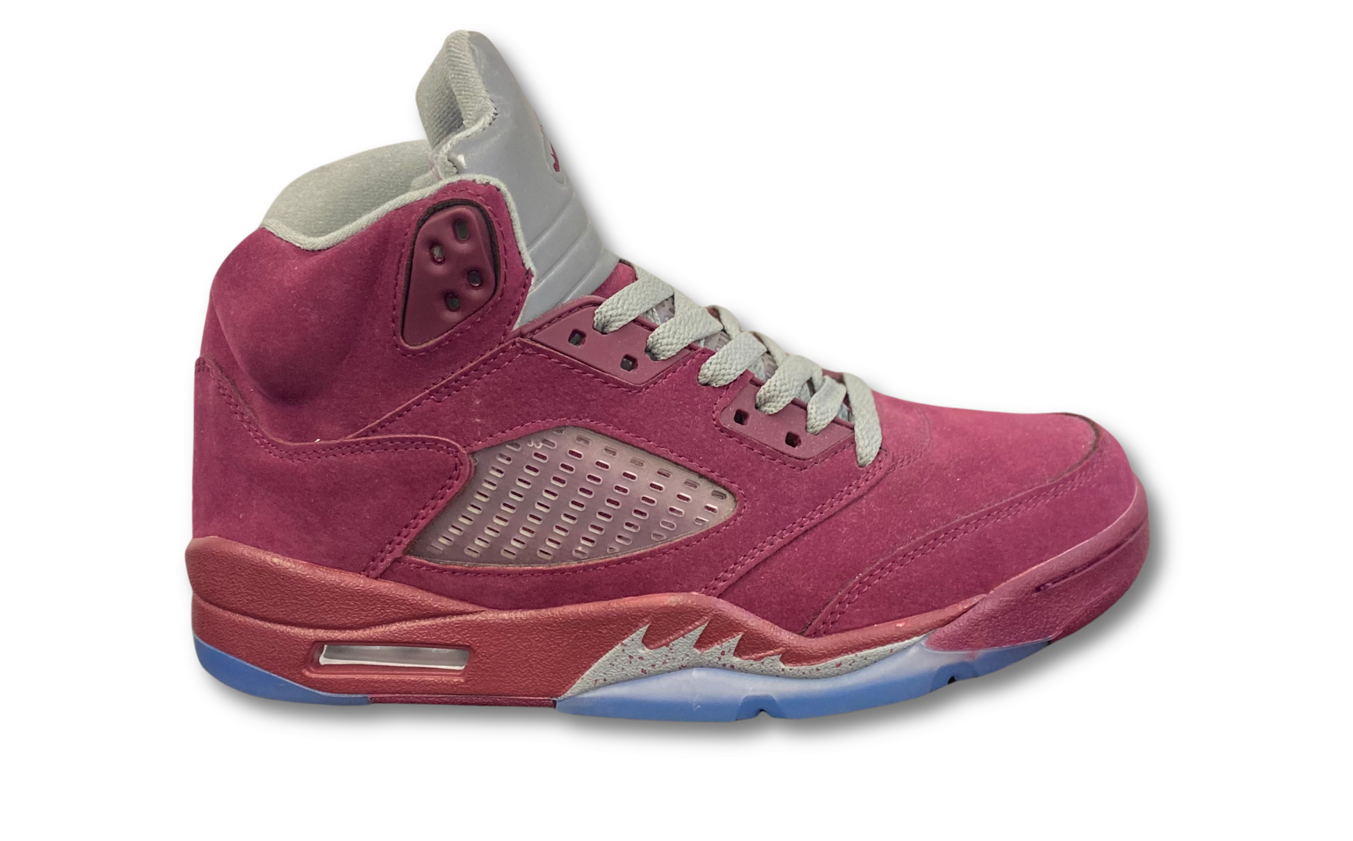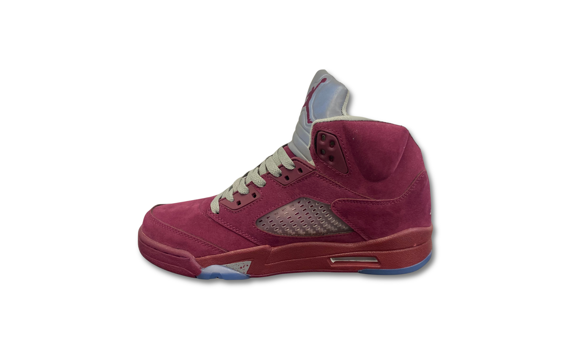 The Air Jordan 5 Retro SE 'Burgundy' for 2023 reintroduces a color scheme that originally launched in 2006. The classic design showcases an upper in burgundy suede, intersected on the side panel with ventilated clear netting and complemented by contrasting stitching. The polyurethane midsole matches the color scheme and displays speckled shark-tooth detailing with a visible Air-sole unit in the heel. The outsole delivers optimal grip with its clear herringbone traction pattern. The heel overlay and tongue are adorned with stitched Jumpman branding with reflective properties that enhance visibility in darker conditions.